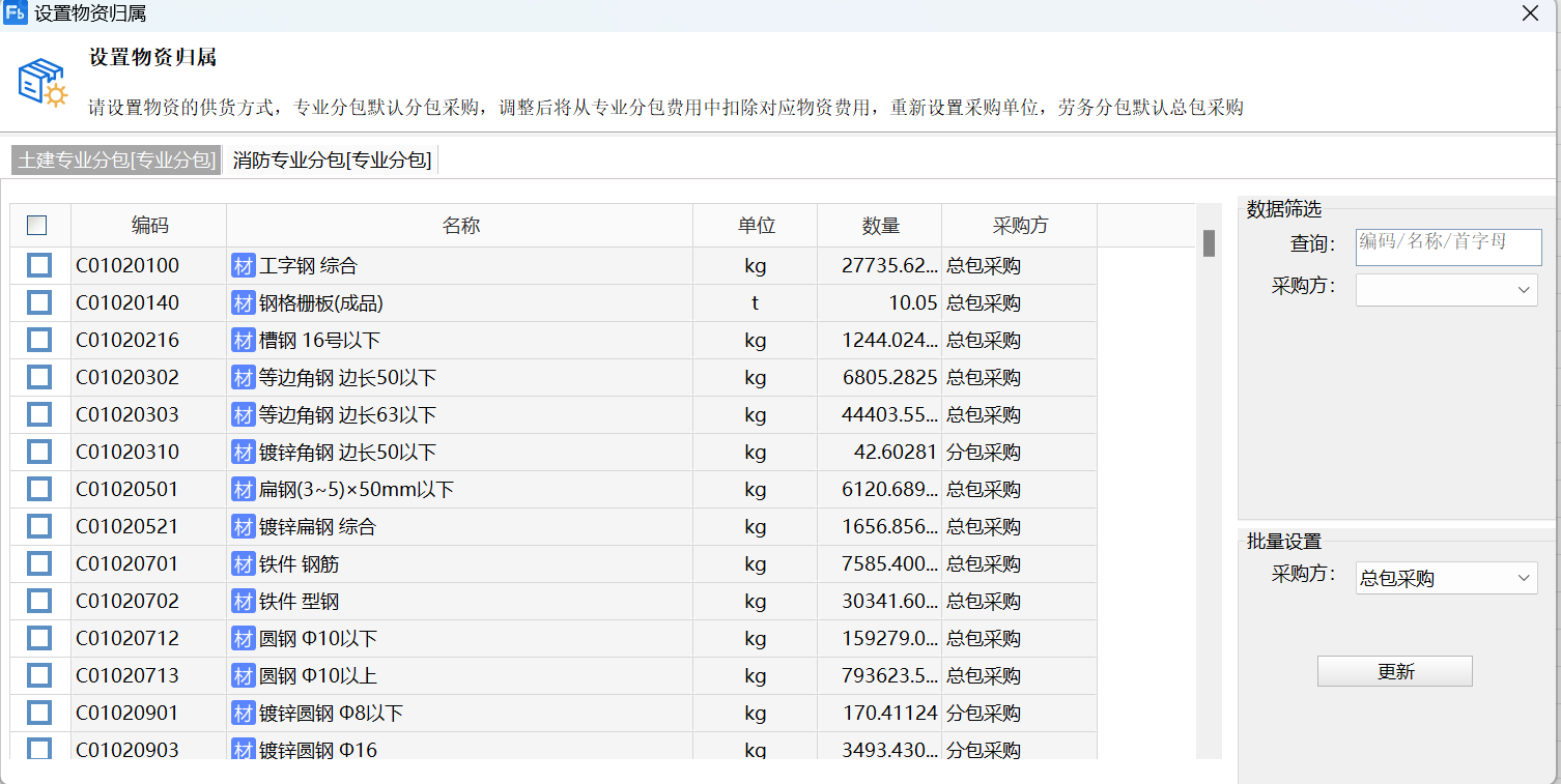 (2)物資采購(gòu)、機(jī)械租賃界面可按分包口徑展現(xiàn)物資機(jī)械明細(xì),并支持批量設(shè)置采購(gòu)方和租賃方,顯著提升易用性。